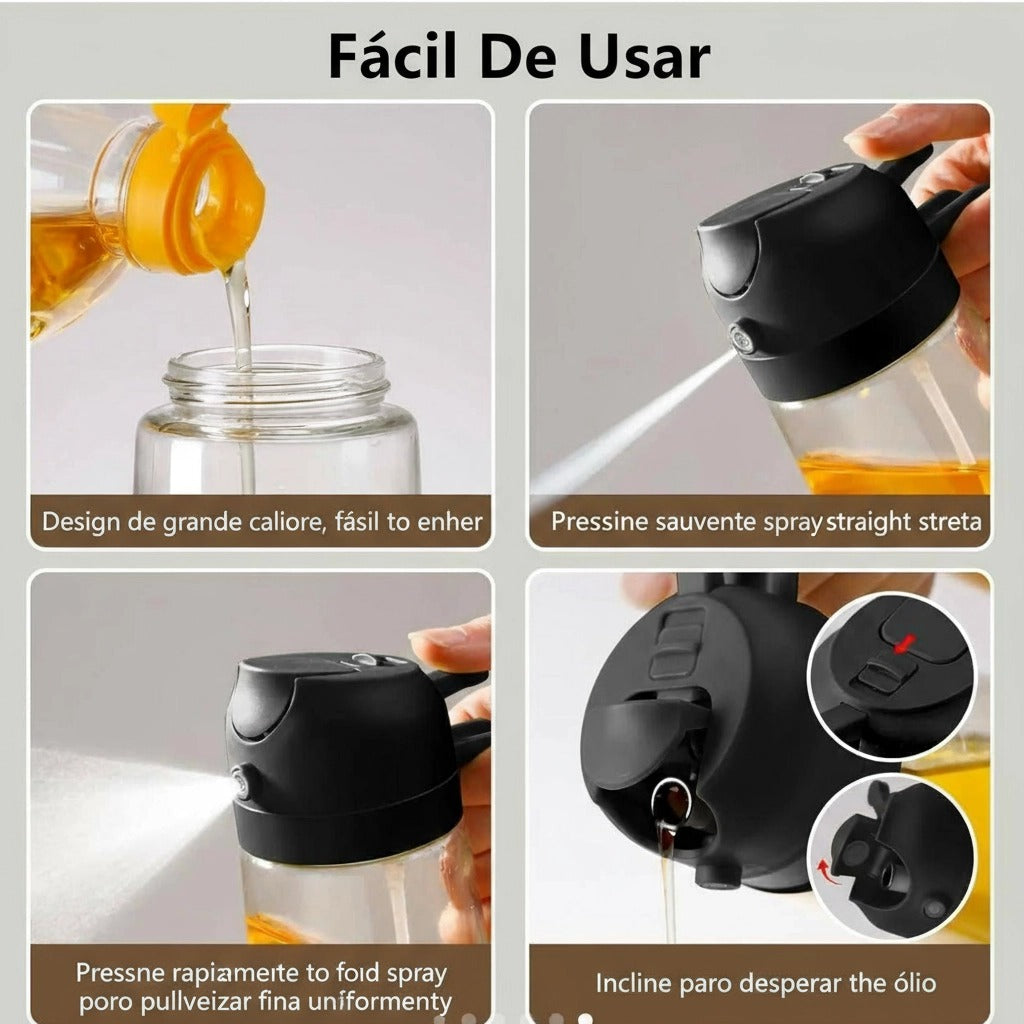 O frasco de óleo apresenta um design de grande calibre que facilita o preenchimento. É possível pulverizar o óleo com facilidade, pressionando suavemente o bico para obter uma linha reta de névoa fina, que se espalha de maneira uniforme. O frasco também conta com um mecanismo simples para despejar o óleo, e um sistema de vedação que evita vazamentos. Ideal para controlar a quantidade de óleo utilizado de forma precisa e sem sujeira.